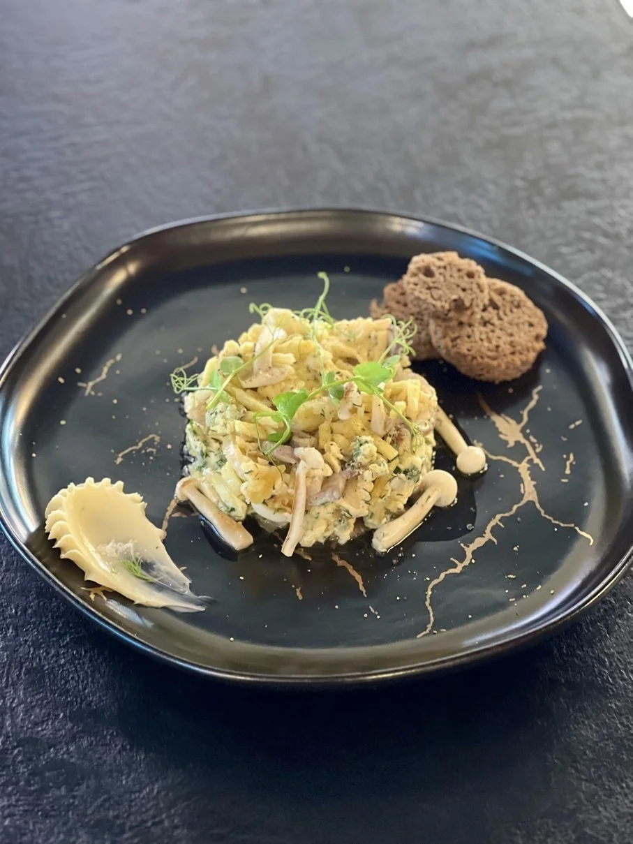 Scrambled Eggs with Autumn Mushrooms, Stewed Leek, and Crispy Potatoes.
